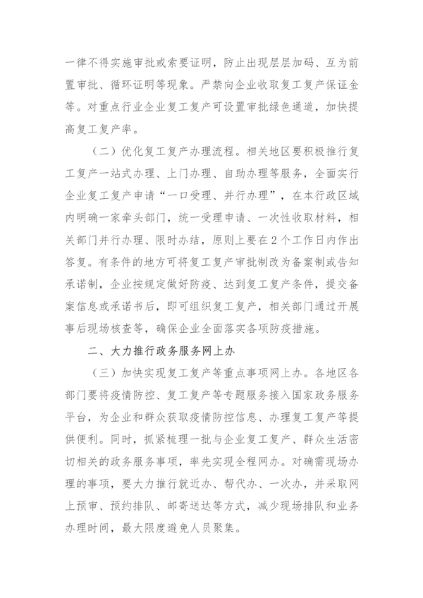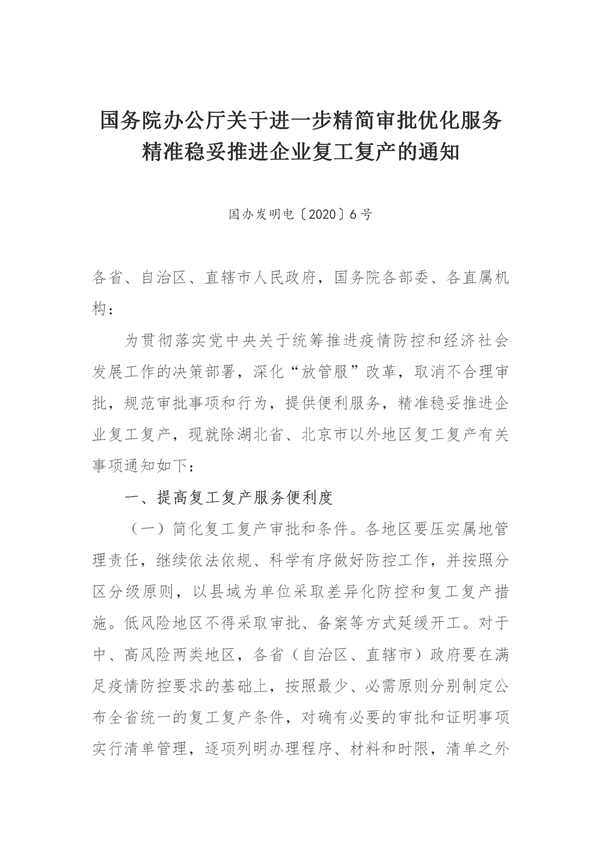 国务院办公厅关于进一步精简审批优化服务精准稳妥推进企业复工复产的通知