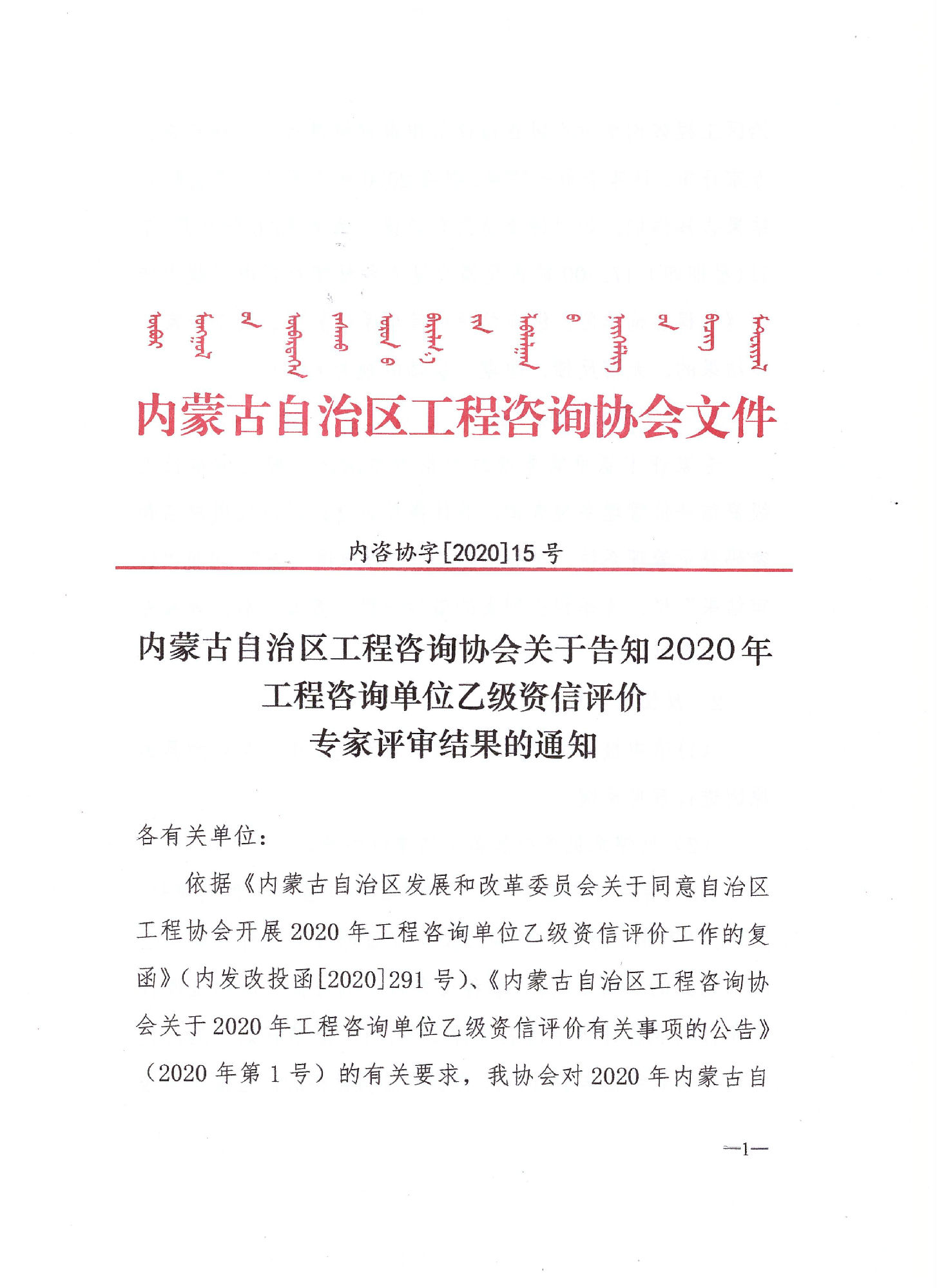 内蒙古自治区工程咨询协会关于告知2020年工程咨询单位乙级资信评价专家评审结果的通知