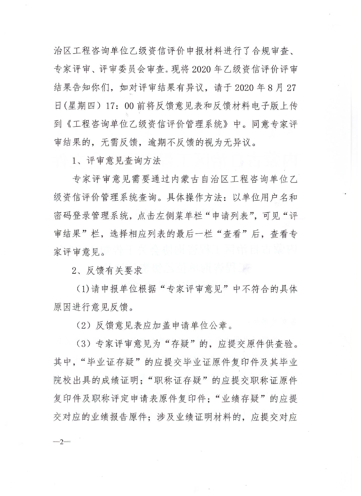 内蒙古自治区工程咨询协会关于告知2020年工程咨询单位乙级资信评价专家评审结果的通知